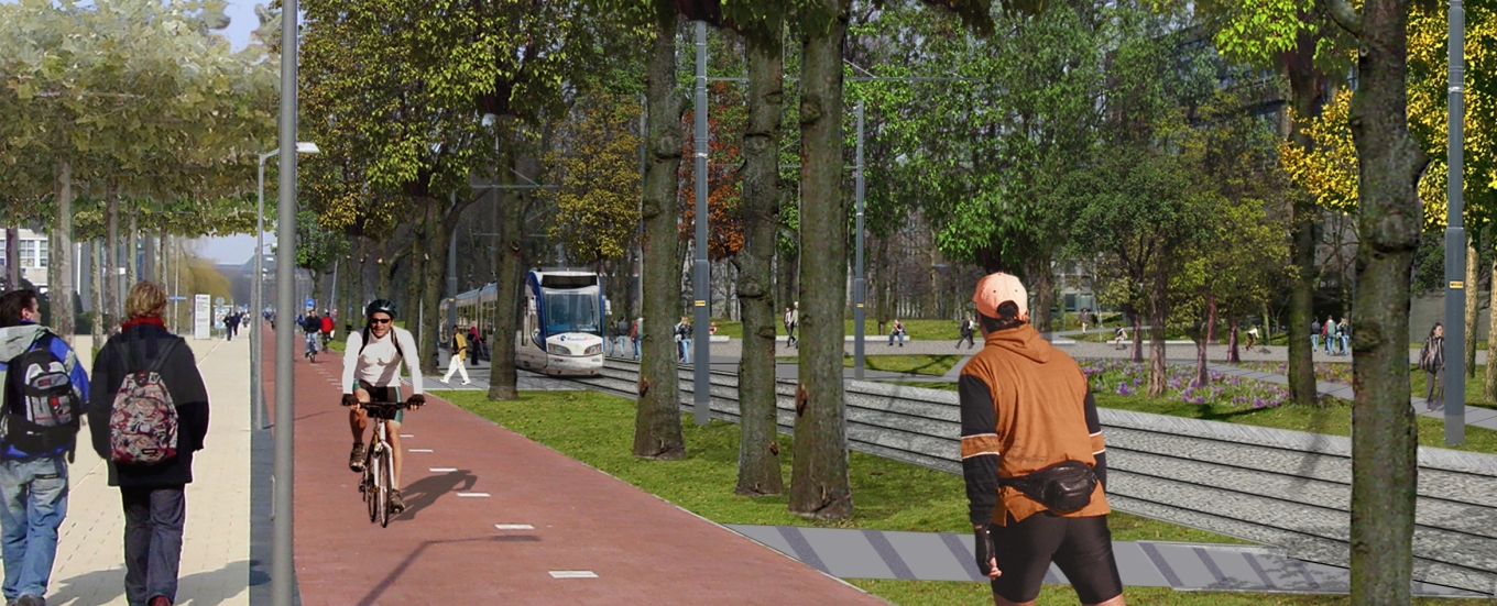I presume that the municipality won against the visionaries at the Executive Board of TU Delft, because whenever you had to go from one building to another, there it was, at the very center of it all. Those unmistakable trails of extruded steel buried flush with the concrete pavement, on which buses ride with frequency, collecting students and the occasional confused visitor, unsure why there are no trams to be seen on top of the suspiciously rust-tinged rails.