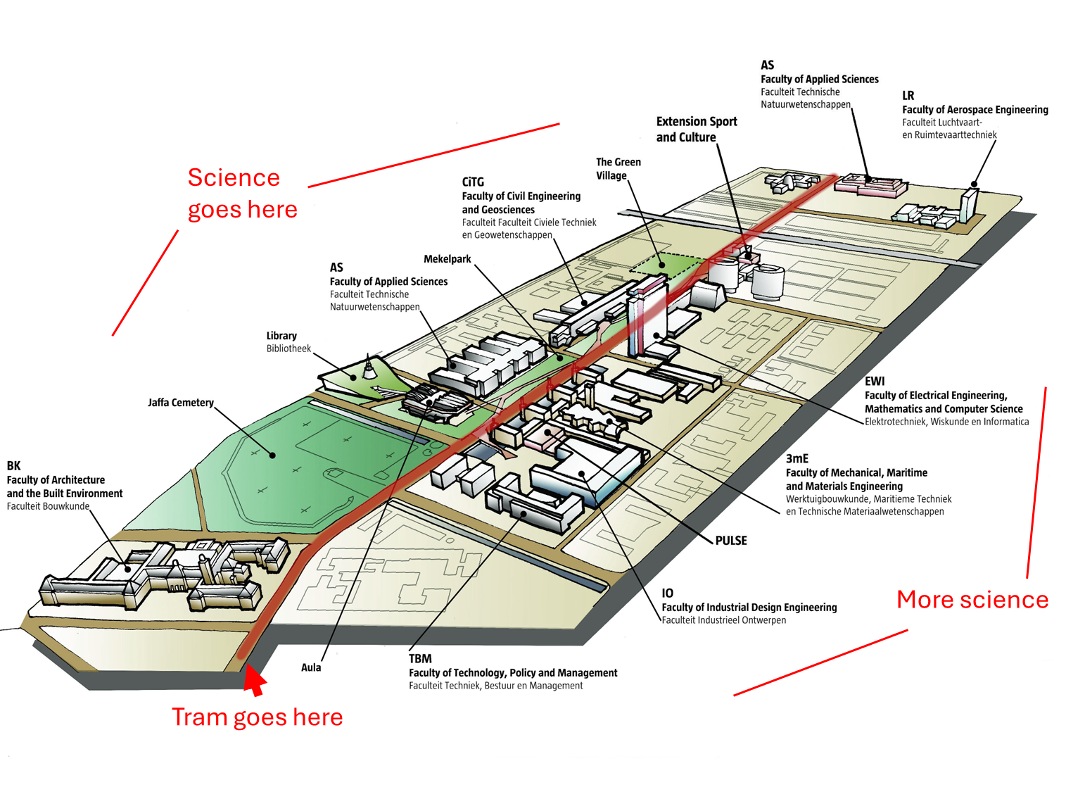 In addition to the special measures to reduce vibrations and EMR, the very best engineers and scientists in these Low Lands pulled out the big guns, the most powerful tool they had saved for tough unforeseen challenges just like this. In 2020, they just cut the last kilometer or so of the route. The intellectual NIMBYs still got a win after all. The tram won’t go to the science park or even the southern part of TU Delft, where my faculty is located. I say “southern part” because yes, there is a highway that cuts right through the campus, of course there is (a provinciale weg, technically). Tram 19 will now terminate before crossing under that road.
