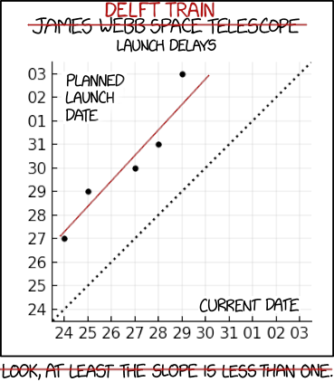 Thankfully, there is always a relevant xkcd. Long before I knew about public transit in these lowlands, I looked forward to the greatest space observatory ever, the James Webb Space Telescope. Same deal: cool nerdy contraption promised to be delivered in the future. Sadly, the project was also infamous for multibillionairily large delays. That comic from 2018, 15 years after the signing of the construction contract and 3 years before the eventual launch of the telescope, managed to tell that story in a way I did not think was possible.